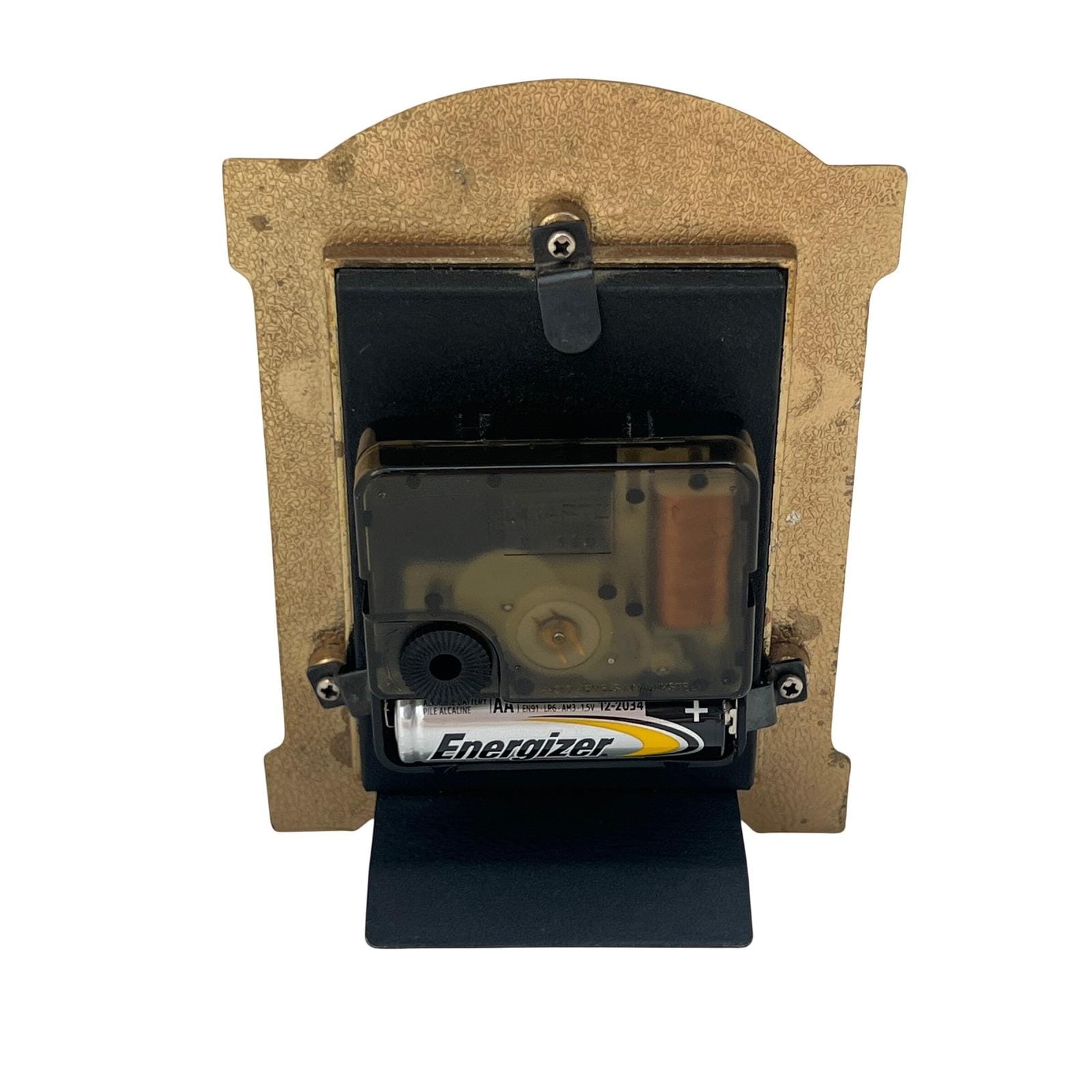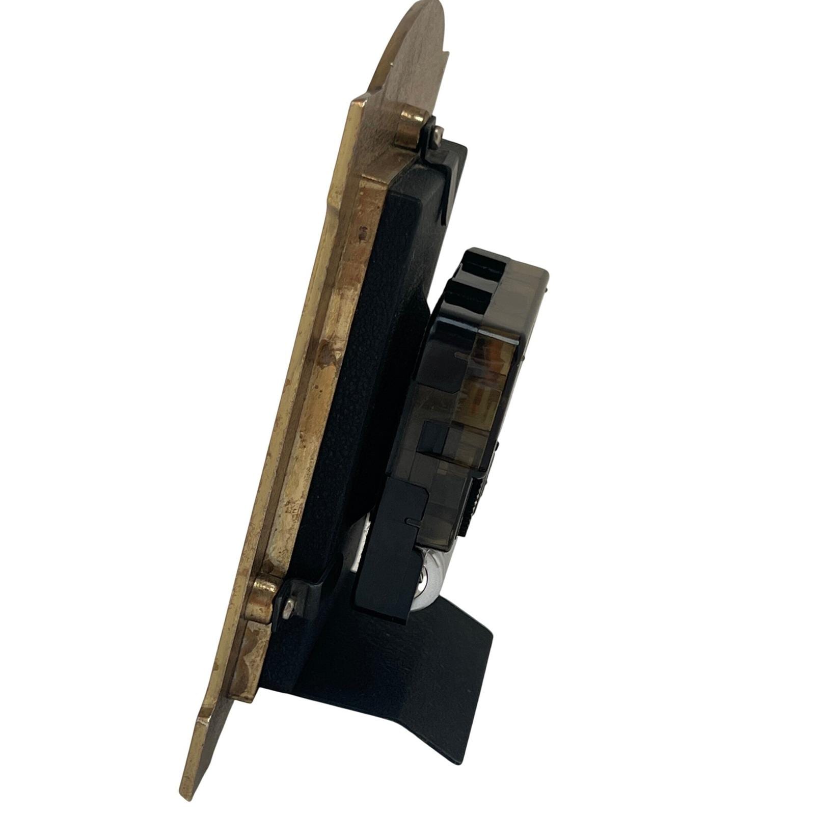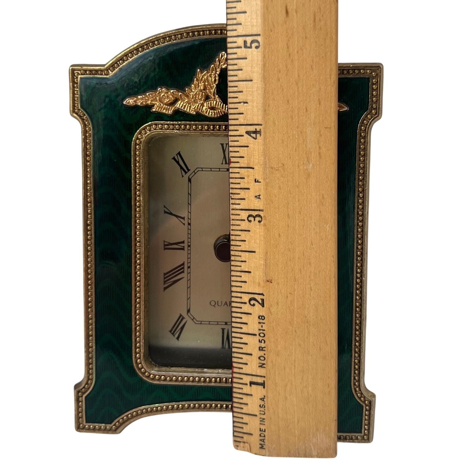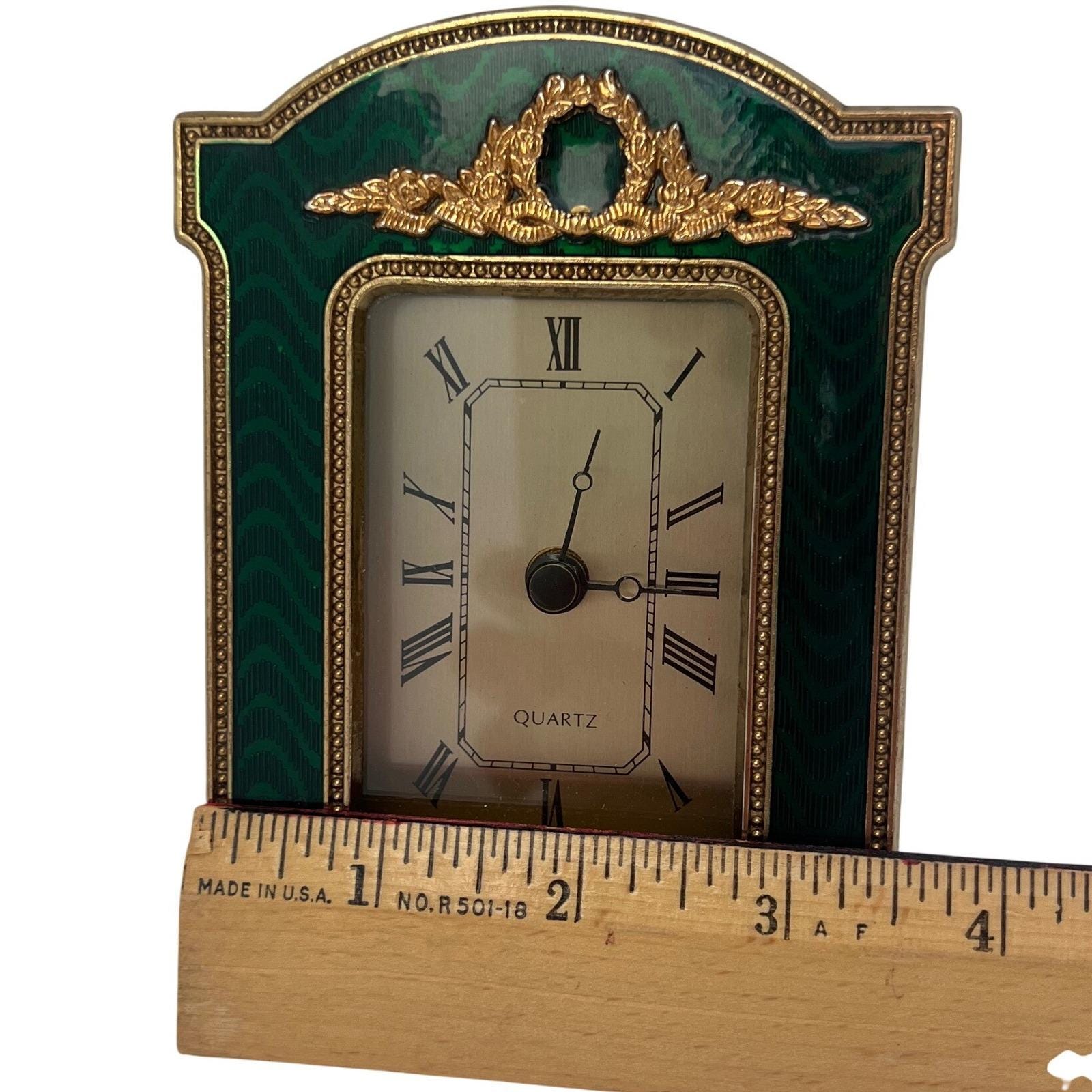 A vintage Regency-style miniature desk clock finished in a rich emerald green, faux-guilloche enamel, framed with ornate gold-tone detailing and a classic laurel wreath crest. The color catches the light beautifully, giving it that jewel-toned depth that instantly elevates a shelf or tabletop.